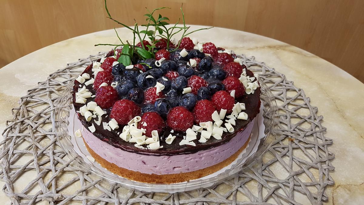 Silloin kun et osaa päättää, ottaakko vadelmaa vaiko mustikkaa, valitse kuningatarrahkakakku, siinähän näet on ne molemmat. Kaiken kruunaa päälle ladotut raikkaat kiteeläiset mustikat ja vadelmat.