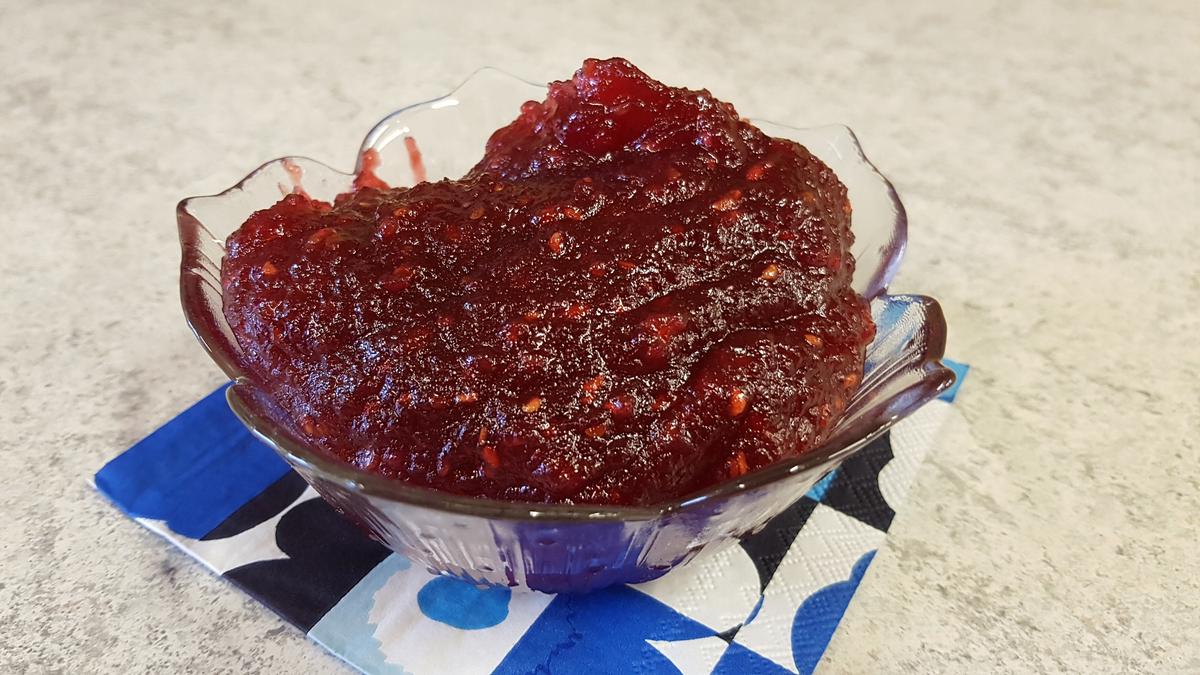 Ainekset; vadelma (60%), sokeri, tärkkelyssiirappi (vehnä- ja maissitärkkelys), vesi, sakeuttamisaineet (E1442 maissi, E418, E509), happamuudensäätöaine (E330), väri (E120), säilöntäaine (E202), aromi, suola